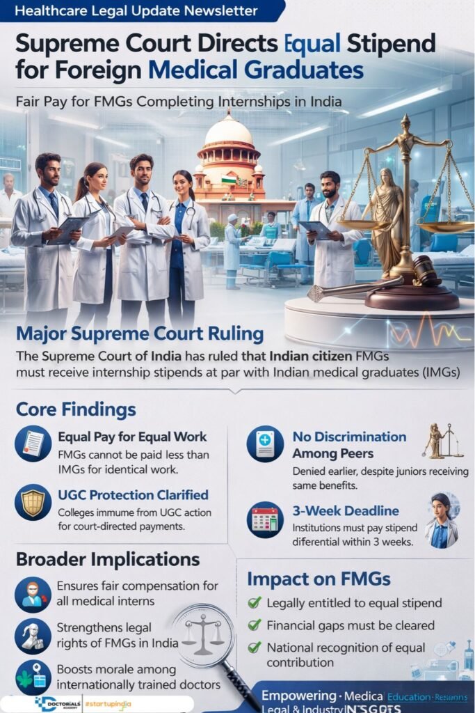 In a significant judgment, the Supreme Court of India has ruled that foreign medical graduates (FMGs) who are Indian citizens and have completed their compulsory medical internships in India must receive internship stipends at the same rate as Indian medical graduates (IMGs).